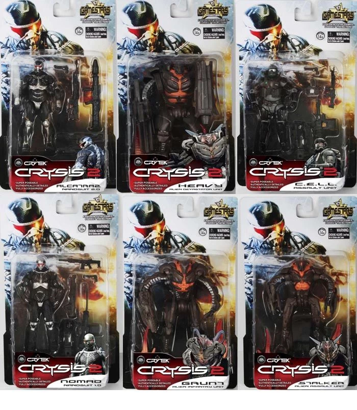 6er Set mit allen erhältlichen Figuren der Serie 1 von Unimax Toys zum Ego-Shooter Crysis 2 (2011). 1x C.E.L.L. Assault Unit, 1x Nomad Nanosuit 1.0, 1x Alcatraz Nanosuit 2.0, 1x Stalker: Alien Assault Unit, 1x Grunt: Alien Infantry Unit und 1x Heavy: Alien Devastator Unit. Die Crysis Figuren sind jeweils ca. 10cm groß (3,75-inch Format) und kommen jeweils einzeln in Blisterkarten verpackt zu Dir nach Hause. Hersteller: Unimax Toys