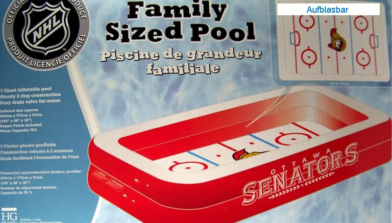 Aufblasbares NHL Ottawa Senators Planschbecken für Groß und Klein. Auf dem Grund ist das Hockey-Rink abgebildet. Besteht aus zwei stabilen Ringen, damit der Pool auch einigermaßen eine Feier übersteht. Dabei gilt immer: Safety first – Sicherheitsvorschriften beachten. Motiv: Ottawa Senators, Maße: 254cm x 173cm x 51cm