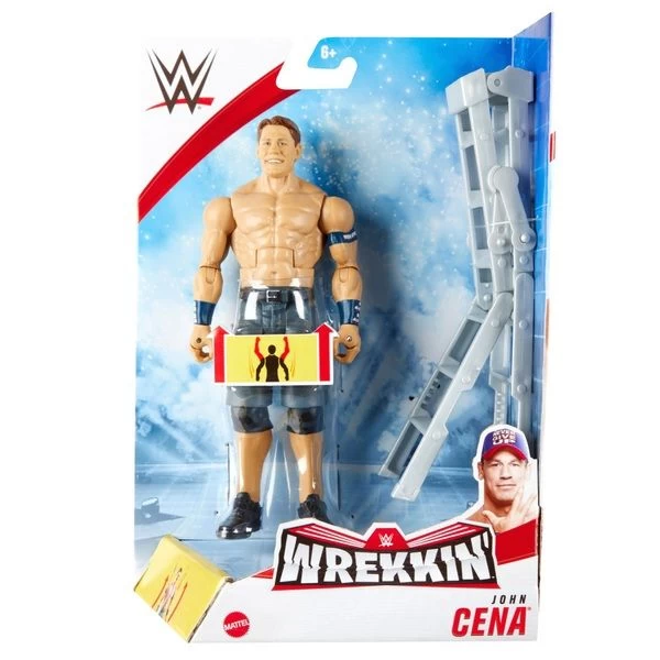 John Cena, eines der bekanntesten Gesichter der WWE, als bewegungsreiche Actionfigur von Mattel. Es ist Zeit, die WWE-Action hautnah zu erleben! Diese Serie von WWE Wrekkin’ Figuren (jede ca. 15 cm groß) umfasst die besten WWE- Superstars mit einem von drei verschiedenen Action-Moves: Schlagen, Punchen oder Treten Zu jeder Figur gibt es ein zerstörbares Zubehörteil wie eine Leiter, einen zerbrechenden Tisch oder Stühle. Die Bewegungen sind durch Zurückziehen der Körperteile möglich und die Action nimmt richtig Fahrt auf. Die Figuren verfügen auch über einen festen Griff, mit dem sie das Zubehörteil greifen und festhalten können. Das Zubehör kann leicht wieder zusammengebaut werden, sodass Kinder die Action immer wieder neu nachspielen können.