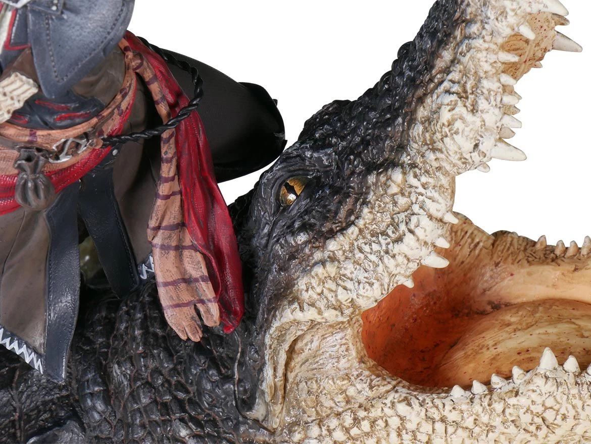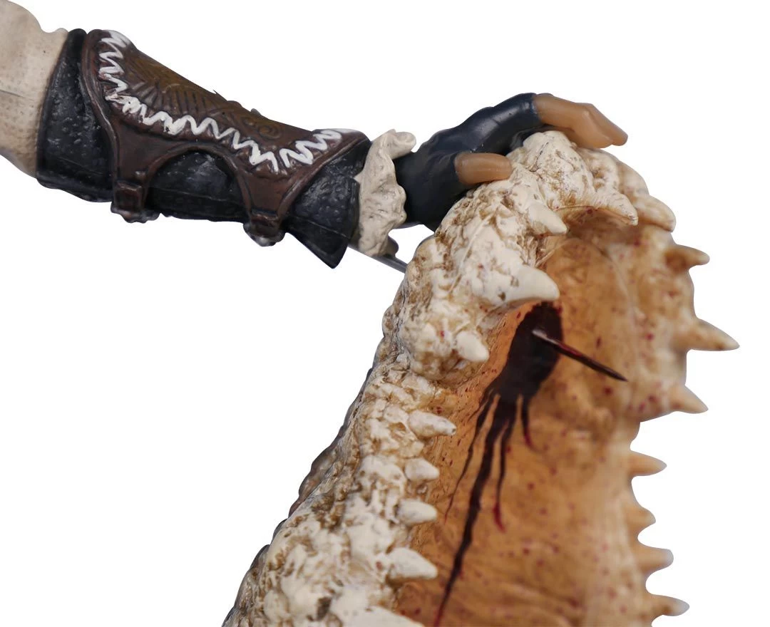 Die Figur bildet ihr tödliches Zusammentreffen mit einem Alligator ab.
