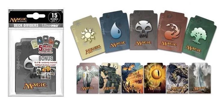 Spezielle Magic Kartentrenner mit Mana-Symbolen. Inhalt pro Pack: Je drei Divider pro Mana-Farbe = 15 Divider, Plus 1 von 6 Artifact Divider (zufällige Auswahl).