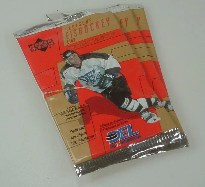 DEL Hockey Sammelkarten von Upper Deck. Saison 2000/2001. Inhalt: 24 Booster-Packs à 6 Karten.